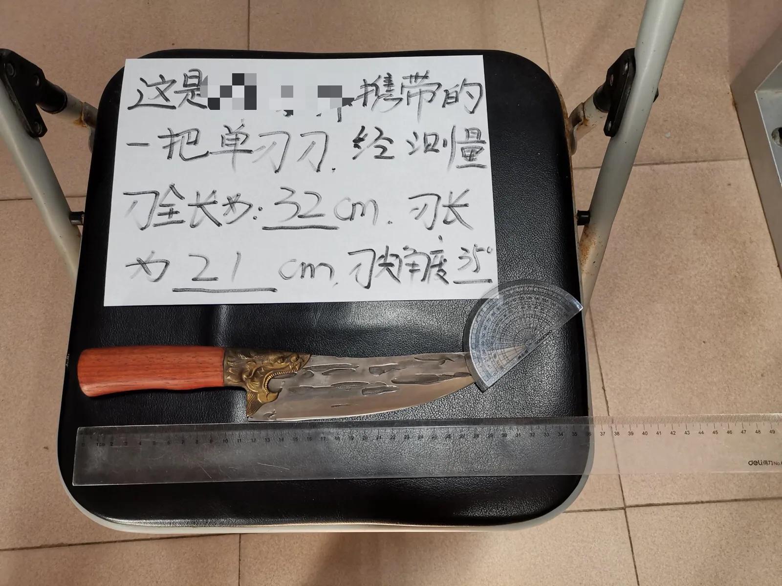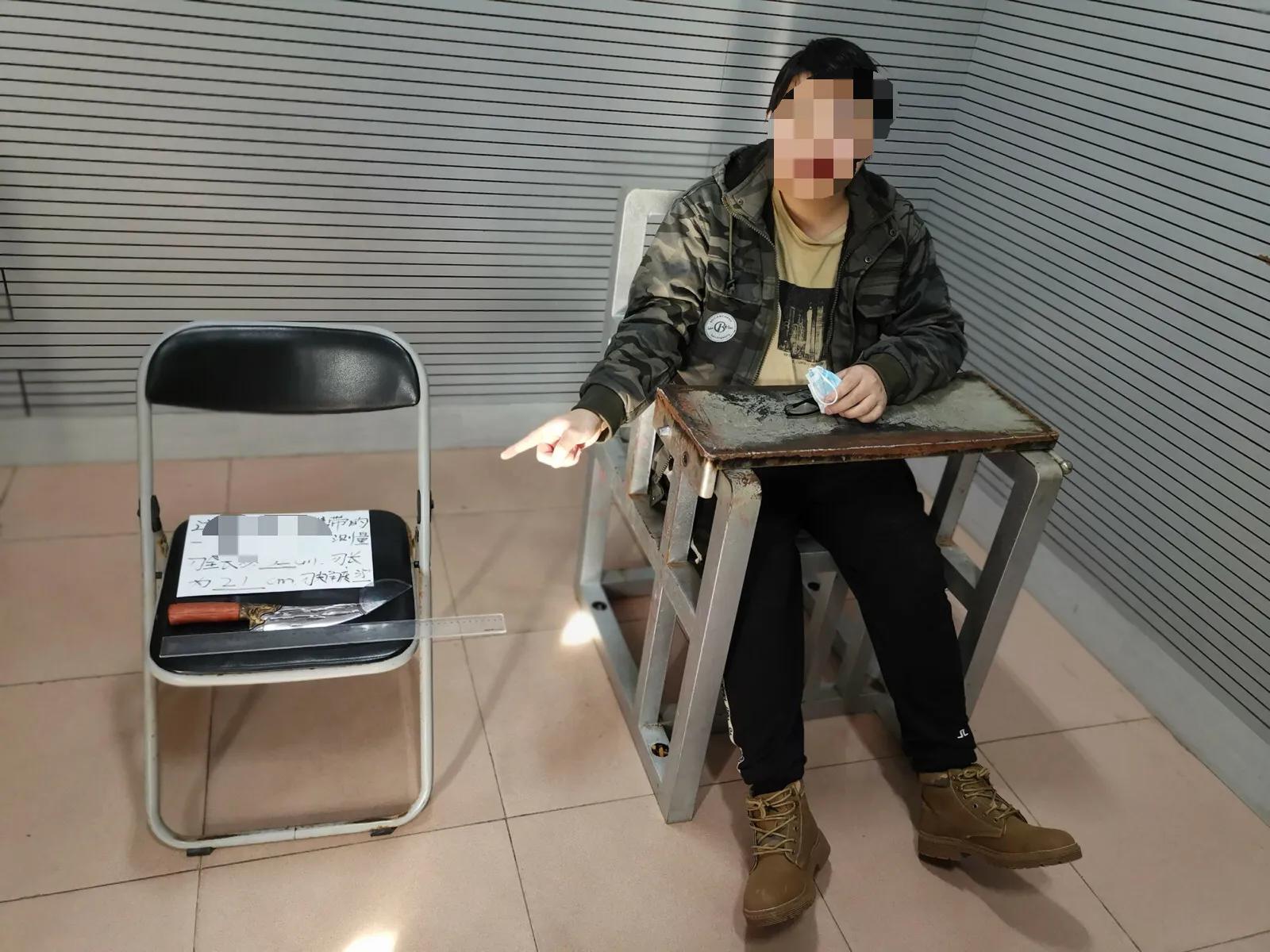 谭某指认其携带的管制刀具 摄影 陈龙安
