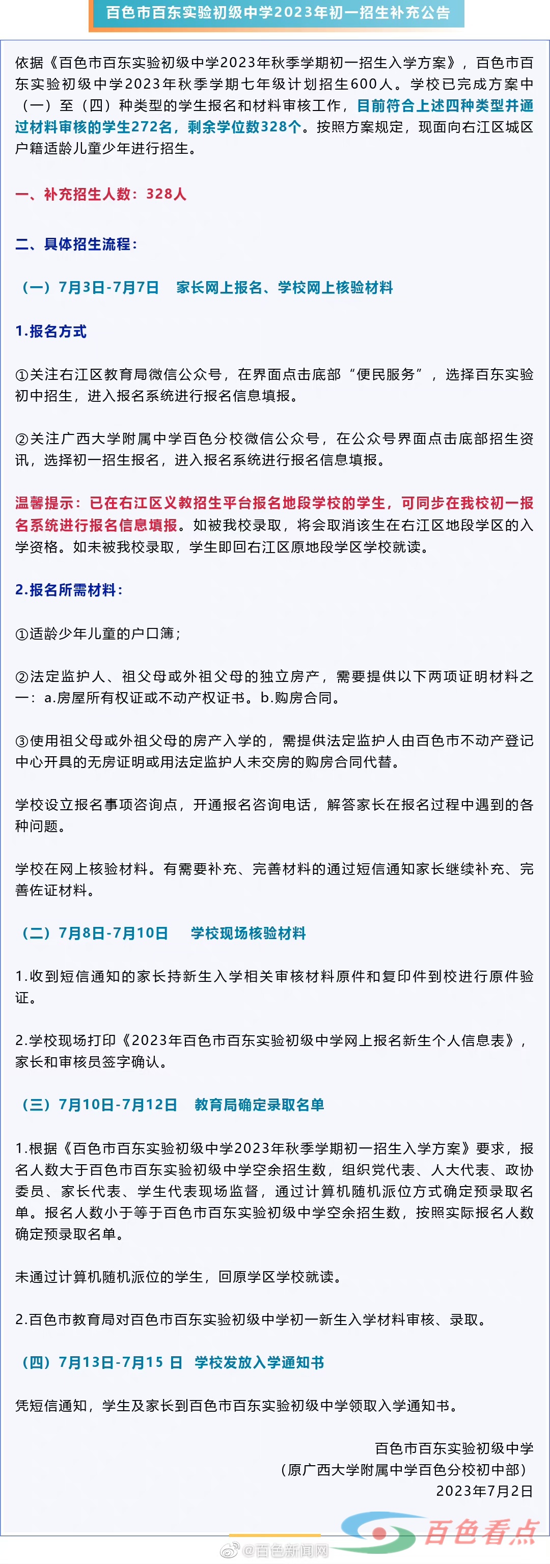 补充招生人数:328人 网上报名时间: 7月3日-7月7日  百色市百东实验初级中学发布 2023年秋季学期初一招生 补充公告 (来源:百色市百东实验初级中学) ​