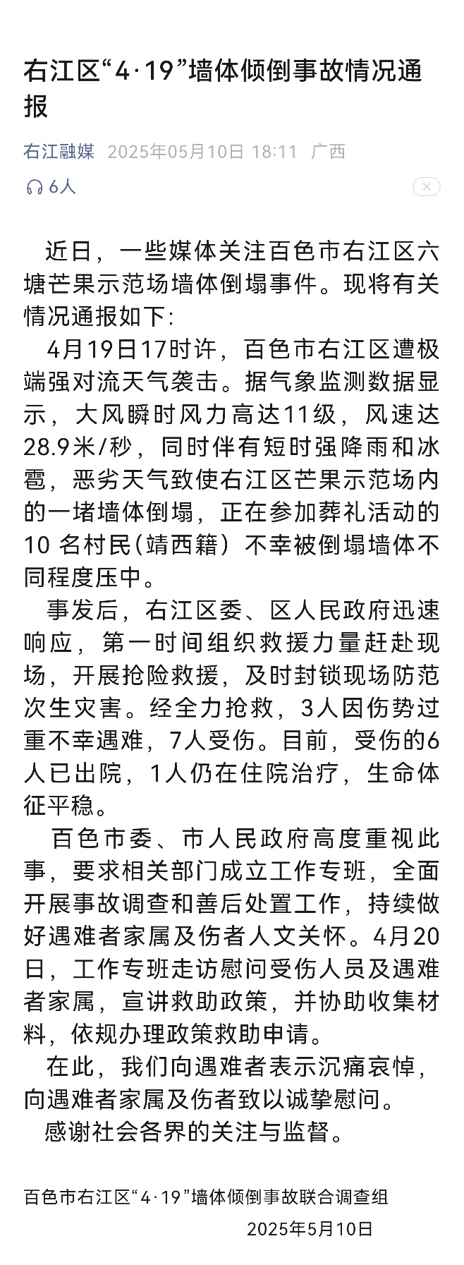 2025年4月19日17时许,广西百色市右江区六塘村遭遇极端强对流天气,瞬时风力达11级(风速28.9米/秒),并伴有短时强降雨和冰雹。灾害导致芒果示范场内一堵墙体倒塌,正在参加葬礼的10名靖西籍村民被压,造成3人遇难、7人受伤。事故发生后,右江区委、区政府立即启动应急响应,组织救援力量封锁现场并开展伤员救治。截至5月10日,6名伤者已出院,1人仍在医院接受治疗,生命体征平稳。