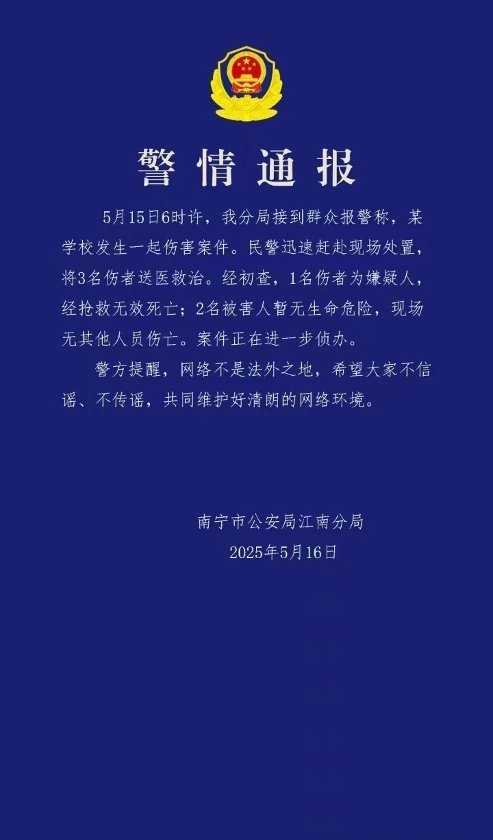 2025年5月16日,广西南宁市公安局江南分局就5月15日发生在辖区某学校的一起伤害案件发布警情通报。通报显示,案件已造成1人死亡、2人受伤,目前嫌疑人抢救无效死亡,受害人暂无生命危险,案件仍在进一步侦办中。
