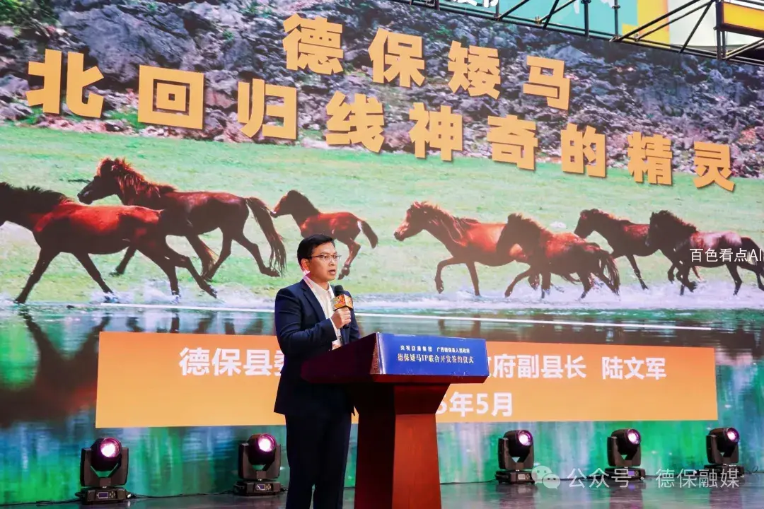 在活动现场,德保县代表团带着独特的文旅资源惊艳亮相,重点对德保矮马等文旅产业融合发展成果进行了全方位推介。德保矮马作为世界稀有的优良马种,不仅是德保县的“活名片”,更承载着丰富的历史文化内涵和旅游开发潜力。德保县代表通过生动的讲解、精彩的视频展示,向与会嘉宾和企业全方位展现了德保矮马的独特魅力,以及德保在文旅融合发展方面的创新实践与未来规划,吸引了众人目光。