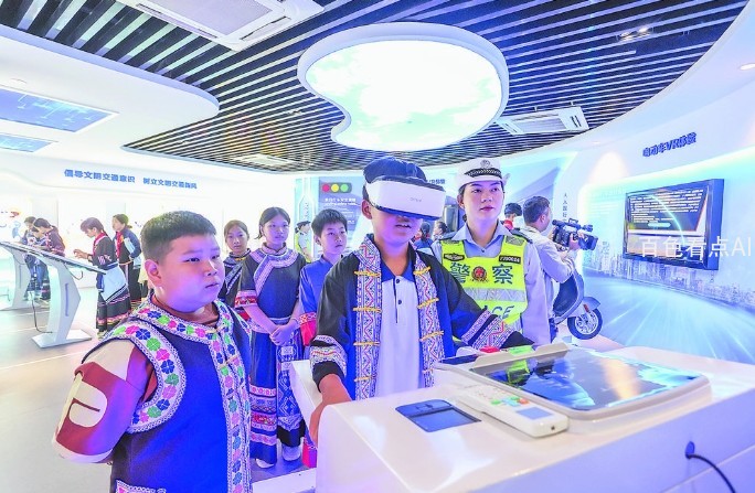 在百色市青少年道路交通安全教育基地,多场景的互动体验让学生们大开眼界。“这是常见的交通标识,这是各类摩托车的牌照样板,这是大货车的盲区……”民警通过各类交通符号和指示信息,耐心地向学生们普及交通知识。并通过播放事故案例视频,告知学生们安全出行的重要性。现场最受学生们欢迎的是沉浸式体验环节,大家通过骑行VR体验、危险驾驶VR体验、电动车VR体验以及知识抢答游戏等,加深了对“知危险、会避险”的认识。