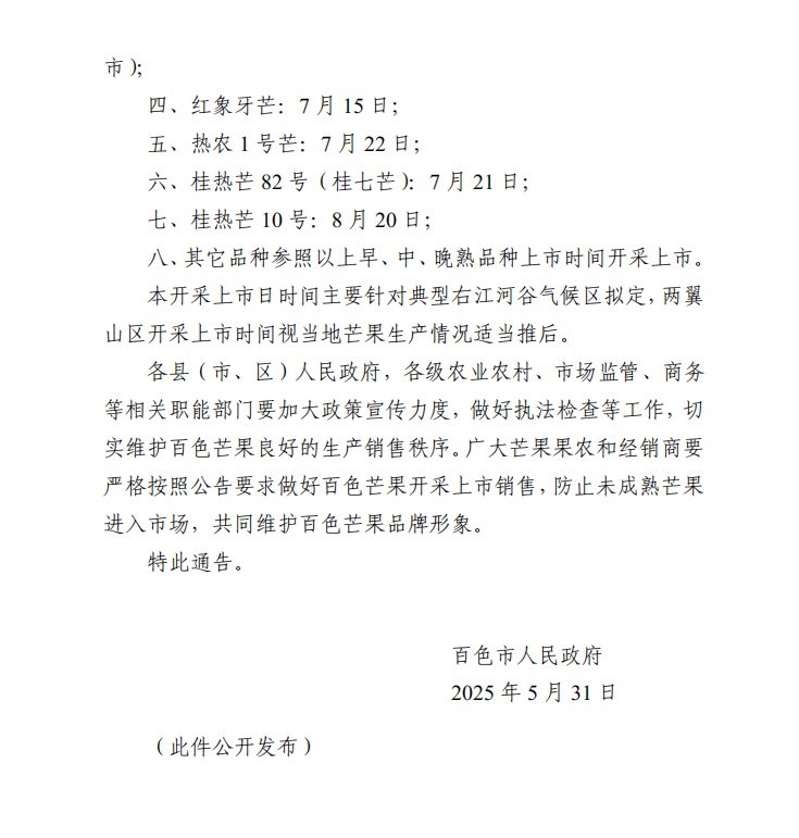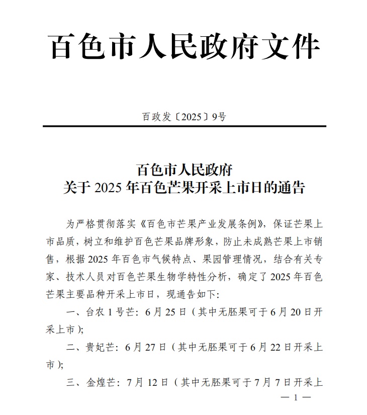百色市人民政府关于2025年百色芒果开采上市日的通告