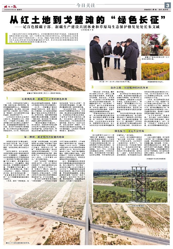 2022年,朱文诚荣获兵直机关“能力过硬、作风优良、业绩突出”优秀处长称号。2024年晋升一级调研员后,他更忙了。“治沙没有终点站,只有连续不断的新起点。”他在新规划里写着:围绕“两环一线”全域治理,聚焦风沙口和沙源地治理,坚持兵地“一盘棋”,构筑科学的阻击战治理格局,筑牢祖国西北生态安全屏障。