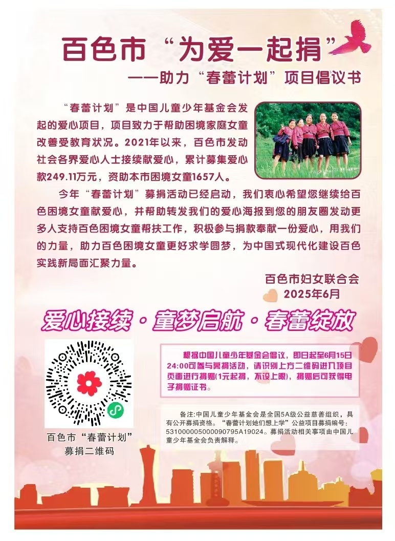 据悉,本次募捐活动将持续至6月15日24时。活动期间,爱心人士可扫描百色市“春蕾计划”募捐二维码参与公益项目,共同点亮春蕾女童的求学梦!