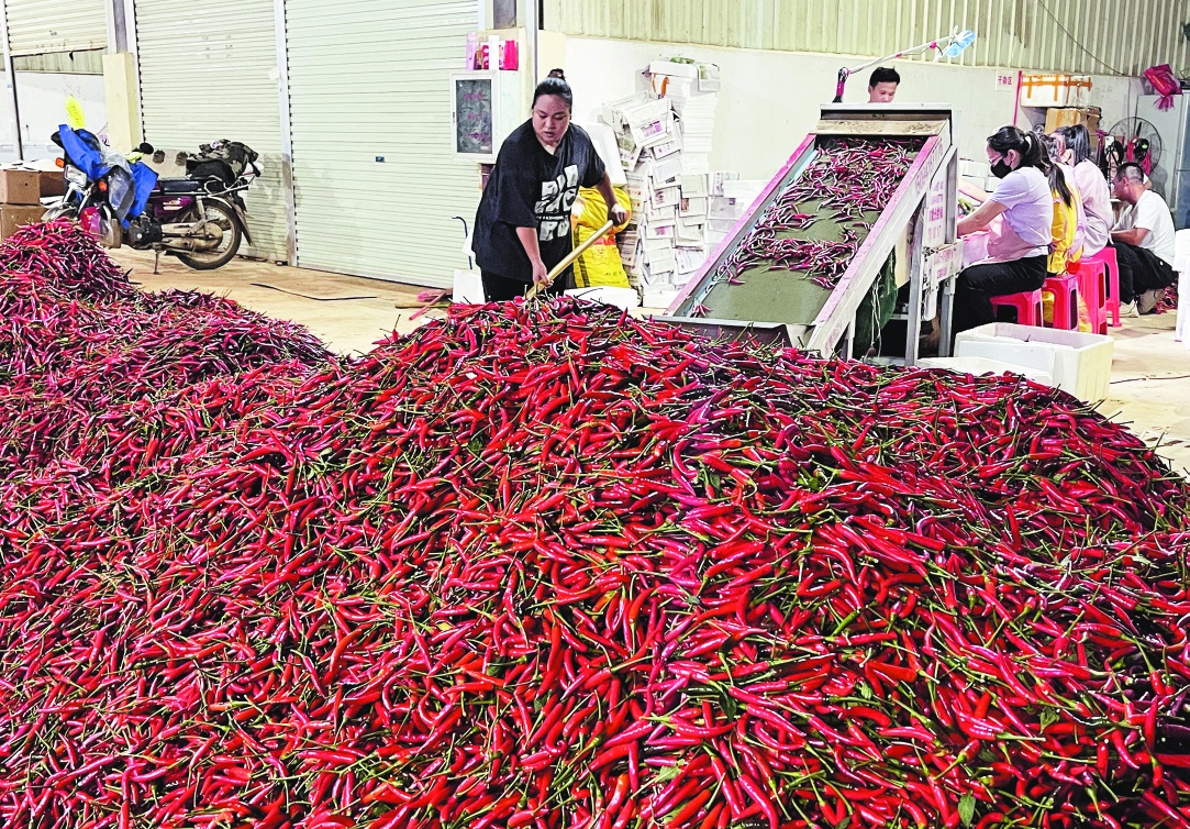 在靖西市古鼎香农产品批发市场,群众在分拣辣椒