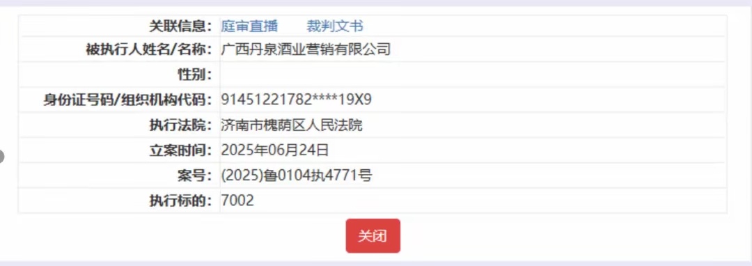 中国执行信息公开网显示,6月24日,广西丹泉酒业营销有限公司被济南市槐荫区人民法院列为被执行人,执行案号为(2025)鲁0104执4771号 ,执行标的7002元。该公司为广西丹泉酒业有限公司(下称“丹泉酒业”)核心销售平台。