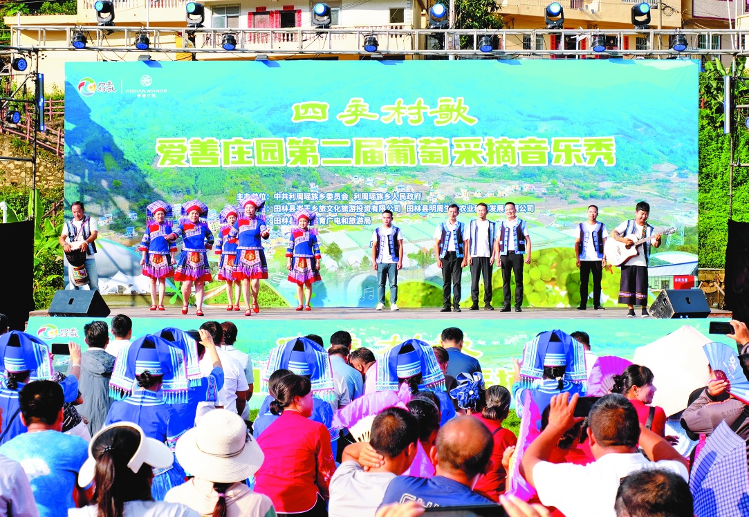 本报讯(记者 卢 茜 黄艳萍 通讯员 岳喜瑞)八月骄阳似火,却难掩田林县利周瑶族乡爱善庄园内洋溢的喜悦。8月1日,“四季村歌”爱善庄园第二届葡萄采摘音乐秀在这里举办。丰收的果实缀满藤蔓,山歌的清亮与现代音乐奇妙交织,共同奏响了一场融合自然之韵、物产之丰与人文之美的乡村振兴交响曲。
