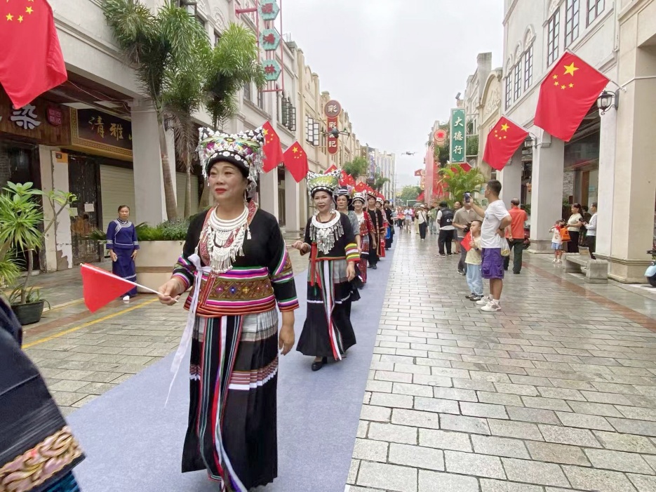 本报讯 (记者 黄艳萍 文/图)10月1日上午,百色解放街人头攒动、歌声嘹亮,“百色非遗承壮韵 国庆红城续新篇”主题活动在此举行。印象那T民族服饰秀巡游、红色歌曲快闪、非遗体验等系列活动轮番上演,吸引了众多市民和游客驻足参与,现场洋溢着浓厚的节日氛围。