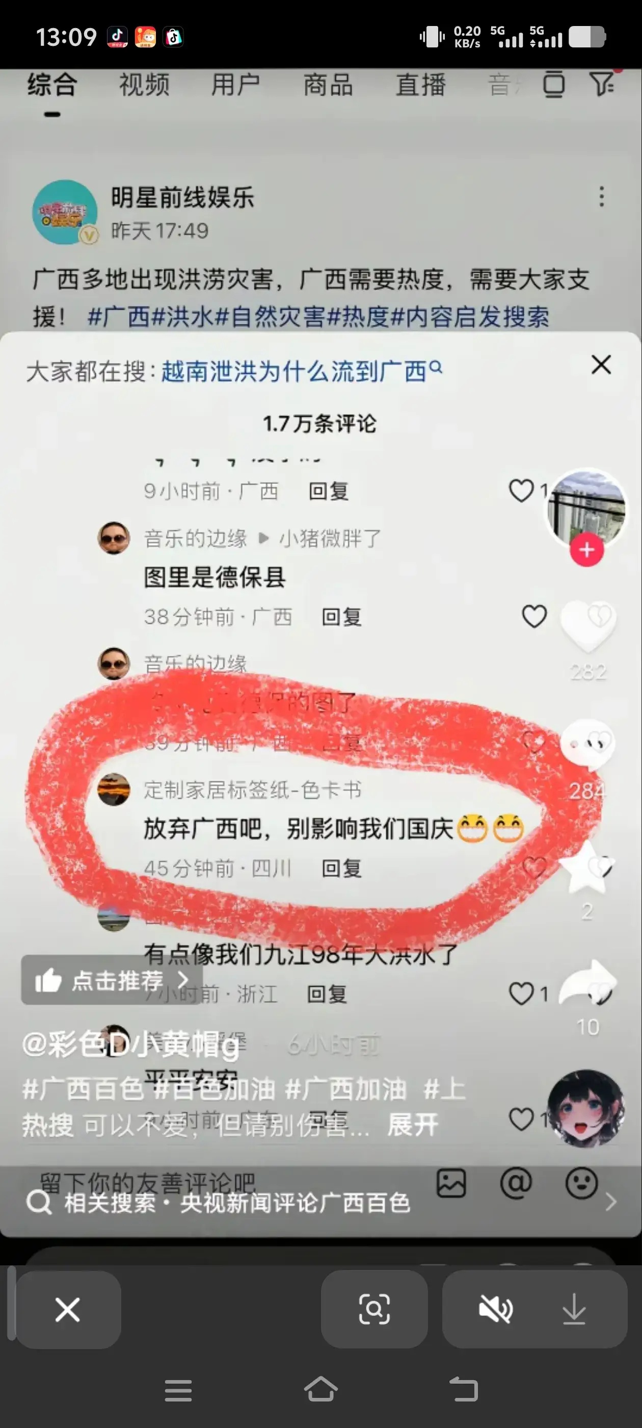 百色遇到了百年一遇的特大洪水,我目前没有看到一个广西网红捐款捐物,反而刷到了吴克群先生给百色捐了十万,这个事情怎么说呢,主要还是没有上热搜,很多网红都不知道,所以没能及时捐款救灾也是情有可原。我看到一位四川的网友在评论区这样说,放弃广西吧,别影响我们享受国庆,这种话都说得出来,是寒了多少人的心。好多网友都说08年四川地震,一天才12块钱,都捐了20块钱,有的人不吃不喝把零花钱都捐了,不管别人怎么说,我们广西雄起,百色加油!