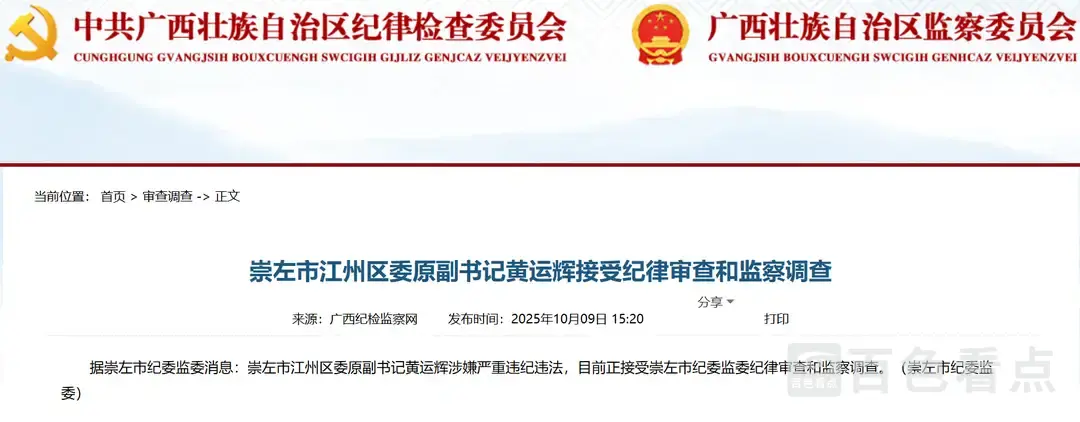 涉嫌严重违纪违法!广西崇左市江州区委原副书记黄运辉接受审查调查