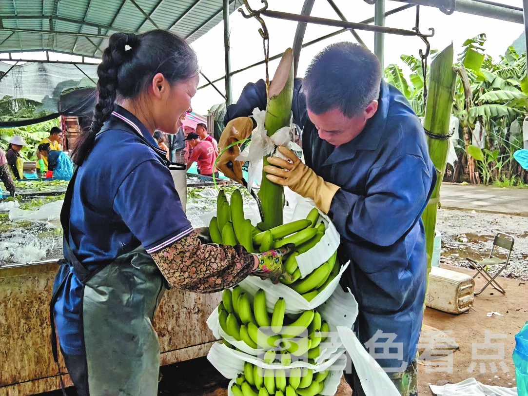 近日,走进田东县作登瑶族乡新安村,香蕉种植基地里一派丰收景象,工人正忙着采摘、搬运香蕉。香蕉经过整理、清洗、加垫减震膜后被整箱打包装上货车,发往外地市场。