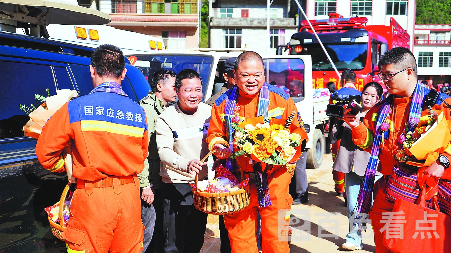 欢送仪式于11月13日上午在多睦小学举行。当天,干部群众自发聚集。村民黄光领为救援队伍准备了糍粑、红薯和红鸡蛋,以及土布吉祥围巾,寓意平安和感恩。多目屯群众黄兰仙动情地说:“我们用山歌感谢救援队。有你们在,我们什么都不怕。”