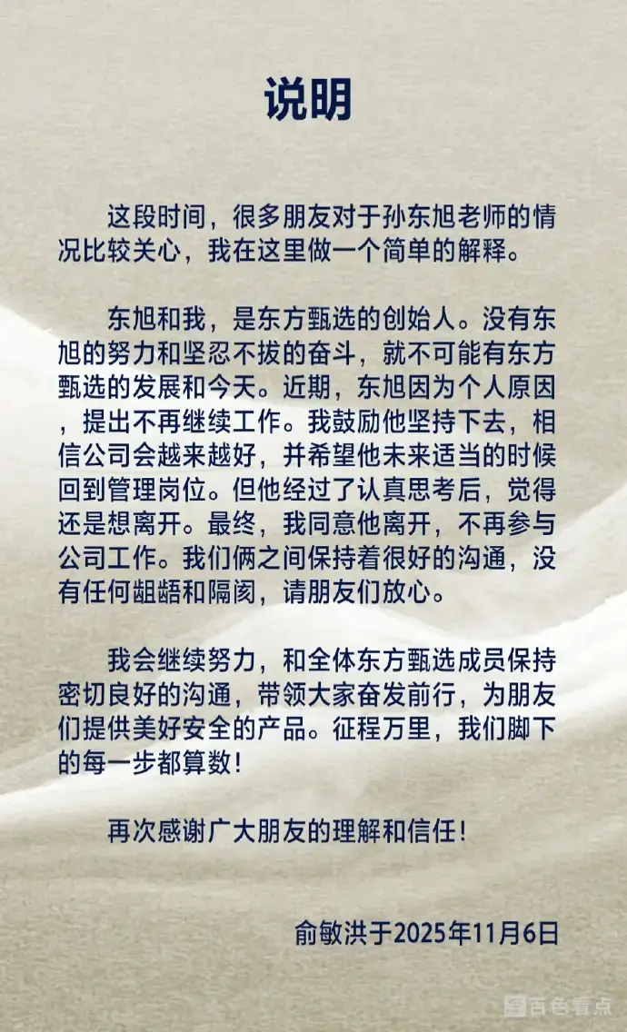 据此前报道,11月6日,俞敏洪发文确认孙东旭从东方甄选离职,并表示“我们俩之间保持着很好的沟通,没有任何龃龉和隔阂,请朋友们放心。”