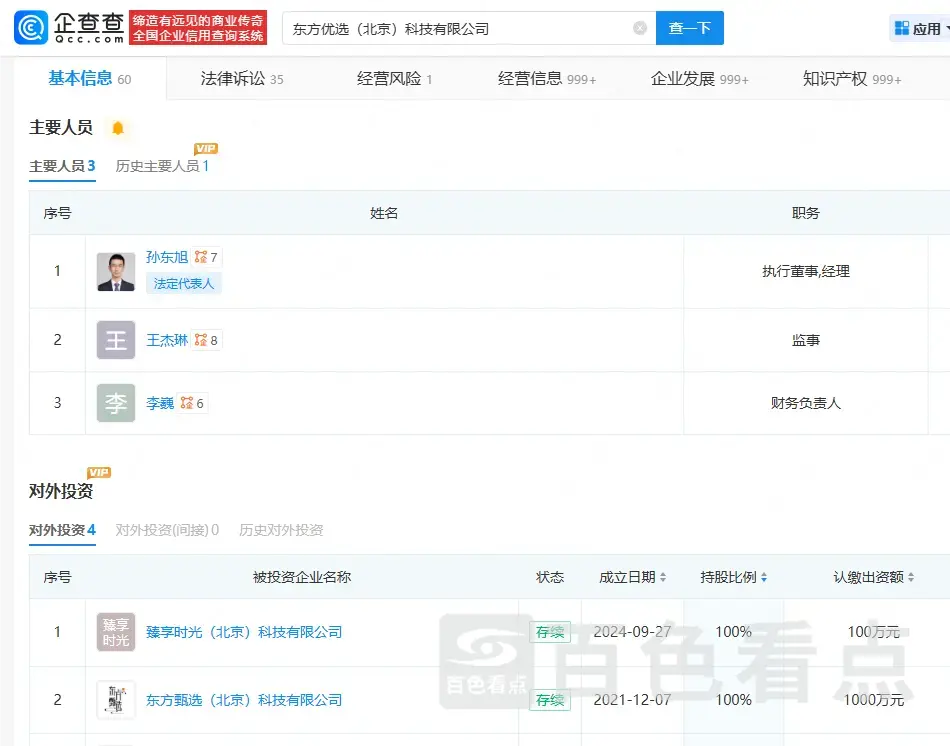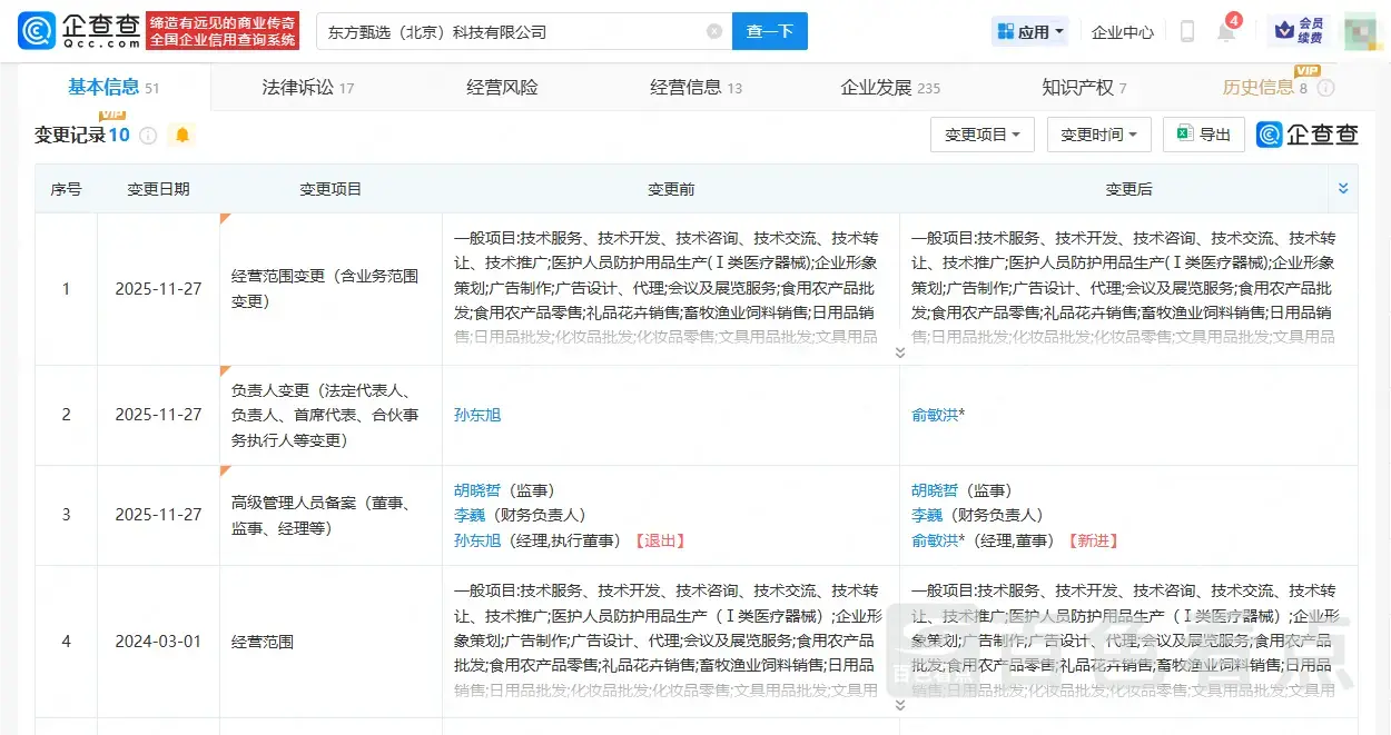 孙东旭卸任东方甄选公司高管,俞敏洪任东方甄选公司法人代表