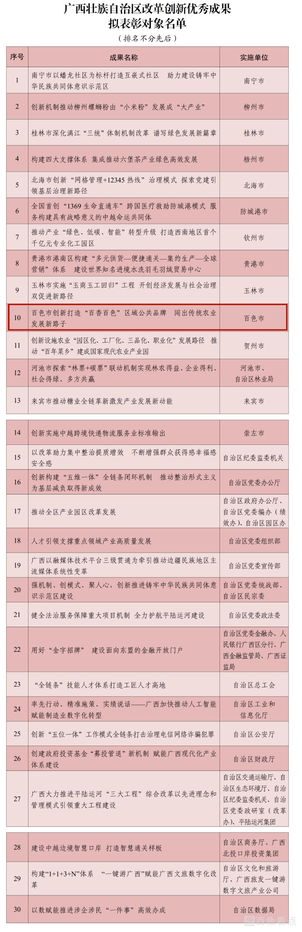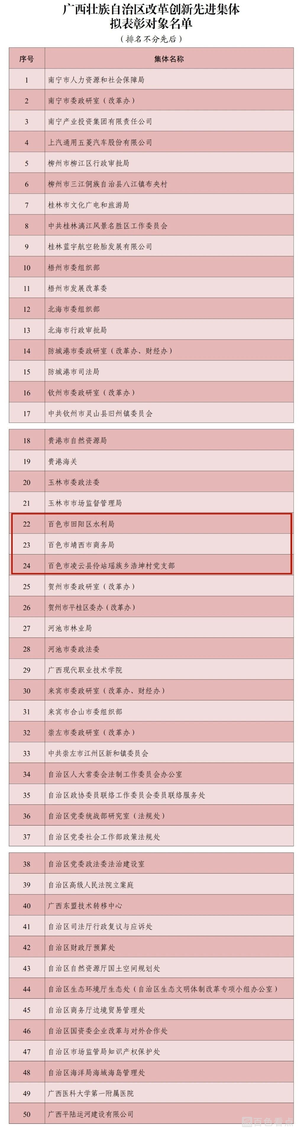 “百色市创新打造‘百香百色’区域公共品牌  闯出传统农业发展新路子”上榜改革创新优秀成果拟表彰对象名单,百色市田阳区水利局、百色市靖西市商务局、百色市凌云县伶站瑶族乡浩坤村党支部3个集体上榜改革创新先进集体拟表彰对象名单,王秀芬、阮小将、农前朝、姚宗林、刘露刚等16人上榜改革创新先进个人拟表彰对象名单。