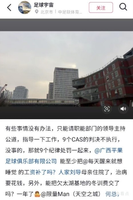 另外,足球经纪人“足球宇宙”在自己的社媒向广西平果俱乐部进行了讨薪。同时他也在评论区表示:“准入材料今天须递交到会员协会, 明天提交到职能部门。 激动人心的大结局,拭目以待。 如果我连自己的教练和球员的利益都无法保障,也不敢主张,那我应该把执照立刻还给国际足联。 ”