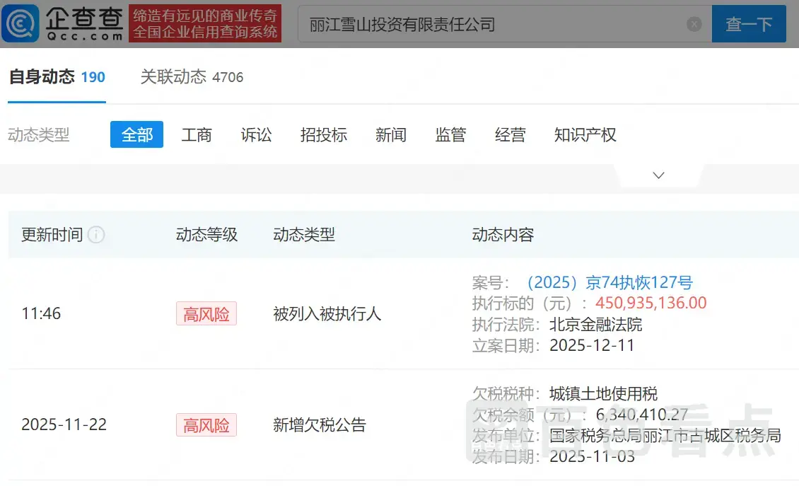 企查查APP显示,近日,丽江雪山投资有限责任公司新增一则被执行人信息,执行标的4.5亿余元,执行法院为北京金融法院。该公司成立于2008年11月,法定代表人为李国栋,注册资本约2.6亿元,经营范围包含房地产开发、文化产业投资等,李亚鹏任公司董事并持股约27.84%。今年11月,该公司因欠税634万被公告,欠税税种为城镇土地使用税。
