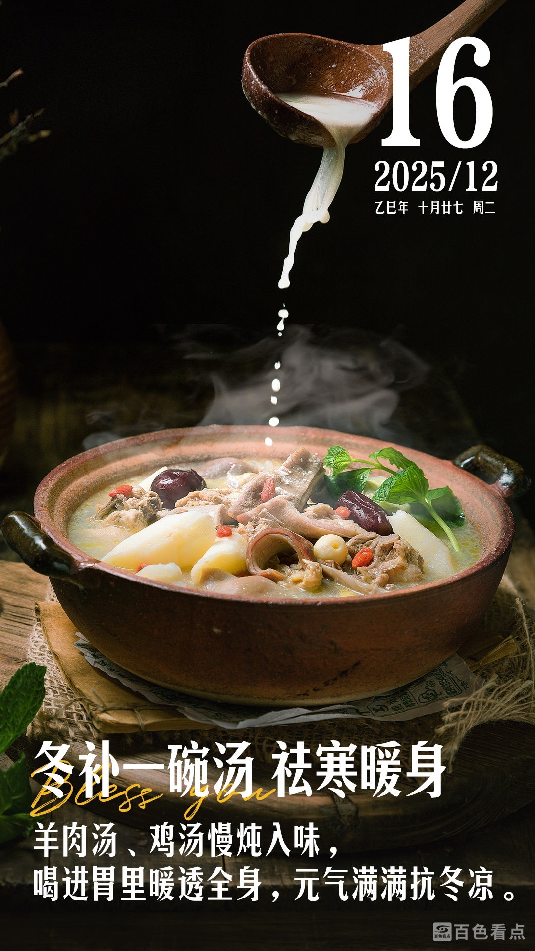 羊肉汤、鸡汤慢炖入味,喝进胃里暖透全身,元气满满抗冬凉。