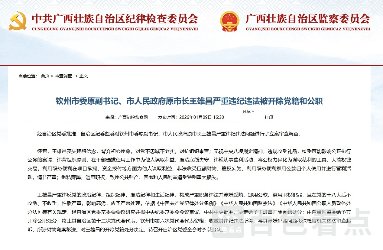 经自治区党委批准,自治区纪委监委对钦州市委原副书记、市人民政府原市长王雄昌严重违纪违法问题进行了立案审查调查。