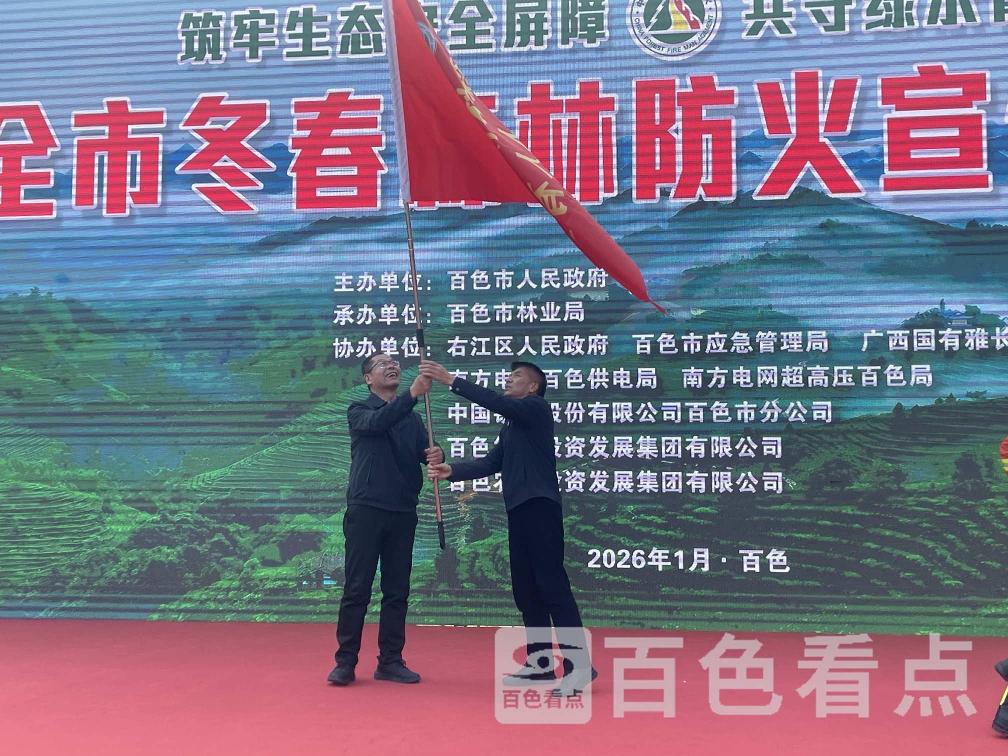 1月9日,百色市冬春森林防火宣传季活动启动仪式在半岛公园中心广场举行。本次活动以“筑牢生态安全屏障,共守绿水青山家园”为主题,副市长黄慧出席并宣布活动启动,自治区林业局防火专员黄可先出席活动。