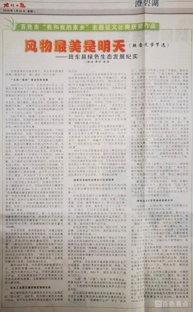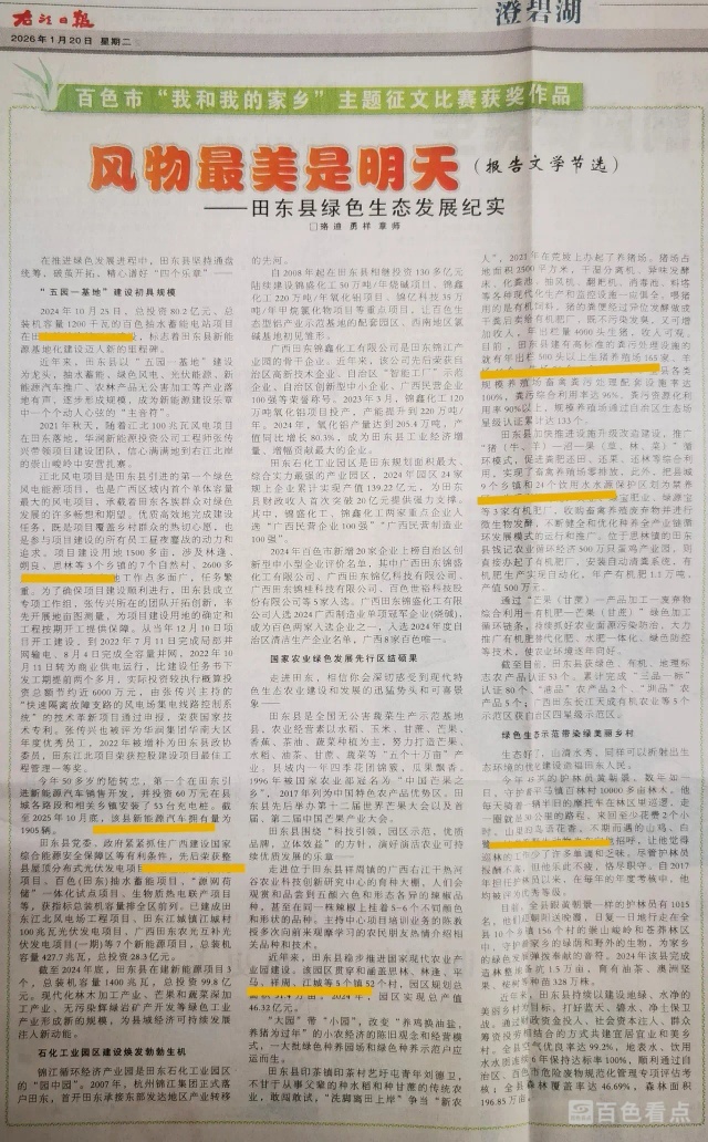 今天无聊,我认认真真地看了《右江日报》2026年1月20日的副刊“澄碧湖”,本来也只是消遣,看到一篇所谓的获奖文章,百色市“我和我的家乡”主题征文比赛获奖作品,《风物最美是明天——田东县绿色生态发展纪实》(报告文学节选),全篇约四千字,我看头几行就发现有个数据肯定是错了,于是决定认真仔细地看完全篇,把错误地方找出来,反正也是闲着。