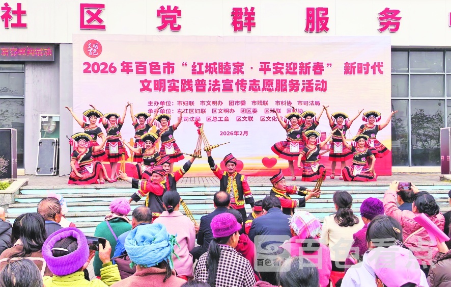 活动现场歌舞飞扬、气氛热烈。右江区文化馆演员带来的红色文艺表演点燃全场热情;四塘镇社马村六洋山歌队以悠扬的山歌,唱出法律法规与家庭美德;“法律明白人”通过快板节目《快板说法》传播反家暴、护权益等知识,节奏明快、寓教于乐;最美家庭代表颜国京分享的家风故事,于平淡中见真情,引发居民强烈共鸣……整场演出中,通俗易懂的歌词配上婉转的旋律,让台下的居民听得津津有味,不时跟着哼唱几句。“壮话山歌普法,听得懂、记得住!”居民黄阿婆笑着说。