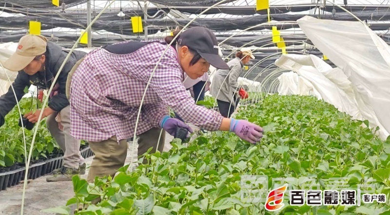 在甘荷村百香果产业园育苗基地,一座座标准化大棚整齐排列,棚内温湿度调控适宜,连片的钦果9号黄金百香果苗绿意盎然、长势喜人。前来务工的村民正忙着浇水、除草、修枝、巡检,细致开展苗情管护各项工作。