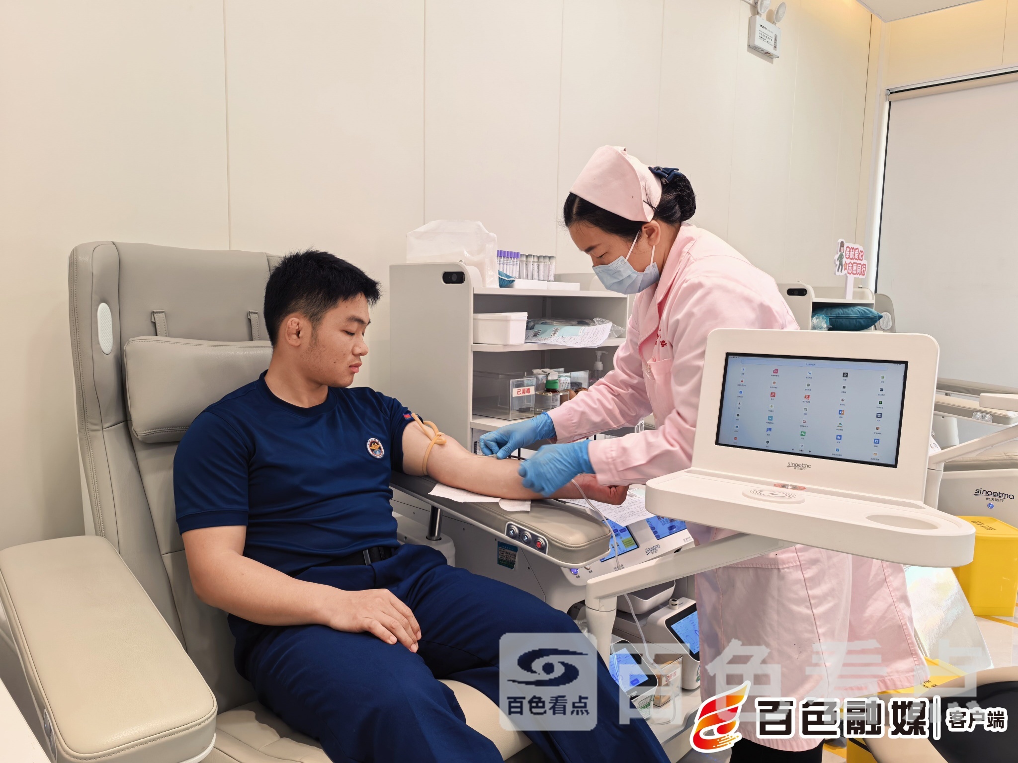 一方有难,八方支援。百色市右江区消防救援大队得知患者的紧急情况后,第一时间组织队员前往百色市中心血站。在医护人员的引导下,消防员依次完成信息登记、健康征询、血液初筛等流程,经检查全部符合献血标准。