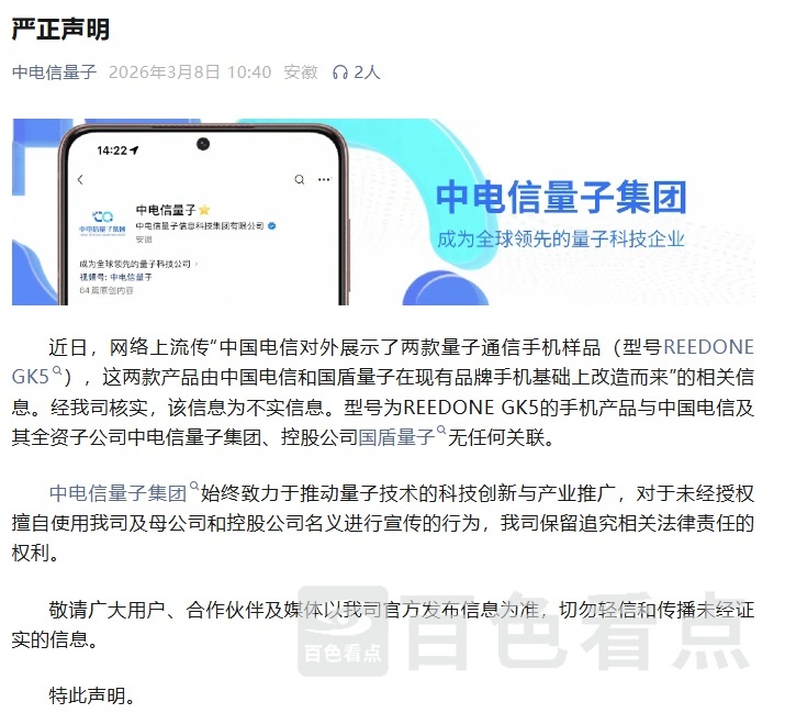 中电信量子集团指出,型号为REEDONE GK5的手机产品与中国电信及其全资子公司中电信量子集团、控股公司国盾量子无任何关联。对于未经授权擅自使用公司及母公司和控股公司名义进行宣传的行为,公司保留追究相关法律责任的权利。敬请广大用户、合作伙伴及媒体以公司官方发布信息为准,切勿轻信和传播未经证实的信息。
