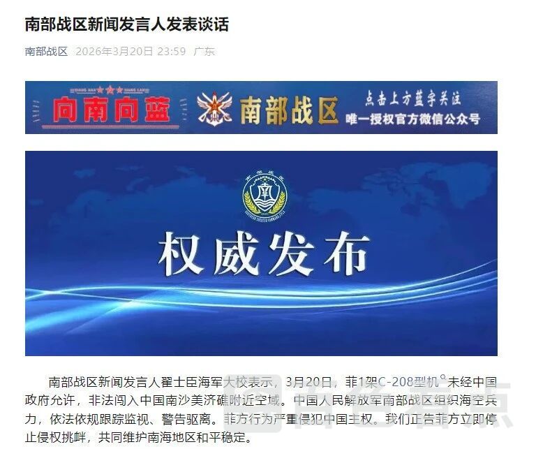 南部战区新闻发言人翟士臣海军大校表示,3月20日,菲1架C-208型机未经中国政府允许,非法闯入中国南沙美济礁附近空域。中国人民解放军南部战区组织海空兵力,依法依规跟踪监视、警告驱离。菲方行为严重侵犯中国主权。我们正告菲方立即停止侵权挑衅,共同维护南海地区和平稳定。
