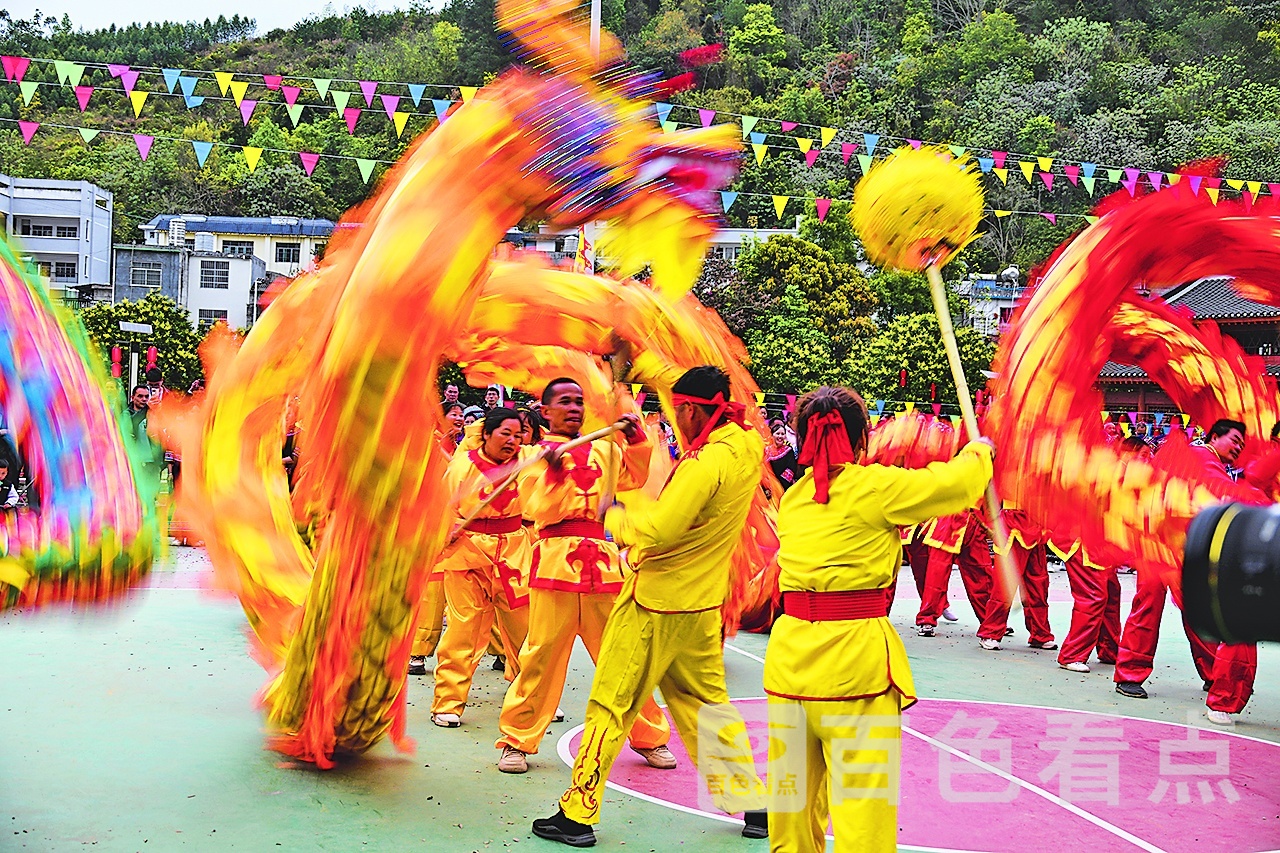 “为了传承我们旧州镇的传统民俗节日,把这天也叫赶龙圩。”当地舞龙传承人黄军雄介绍道。上午9时,随着本次活动的核心环节——“朱砂启运”仪式正式启动,身着精美壮戏服饰的舞龙队员,手举彩龙穿梭在龙圩四大街的青石板路上,壮戏的艳丽服饰与彩龙的缤纷色彩交相辉映,一条条彩龙在古街巷道间蜿蜒游走,吸引不少群众和游客驻足观看、拍照留念。