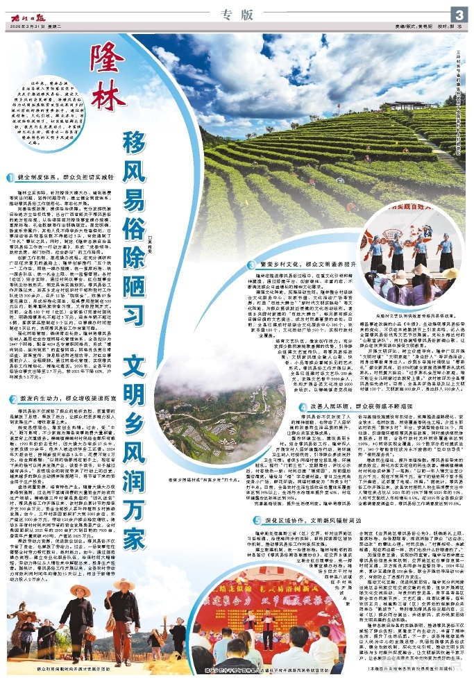 近年来,隆林各族自治县深入贯彻落实党中央关于推进移风易俗、建设文明乡风的决策部署,将移风易俗作为巩固拓展脱贫攻坚成果同乡村振兴有效衔接的重要抓手,通过制度创新、文化引领、群众参与,有效破除陈规陋习,切实减轻群众负担,激发内生发展动力,丰富精神文化生活,探索出一条具有隆林特色的文明乡风建设之路。