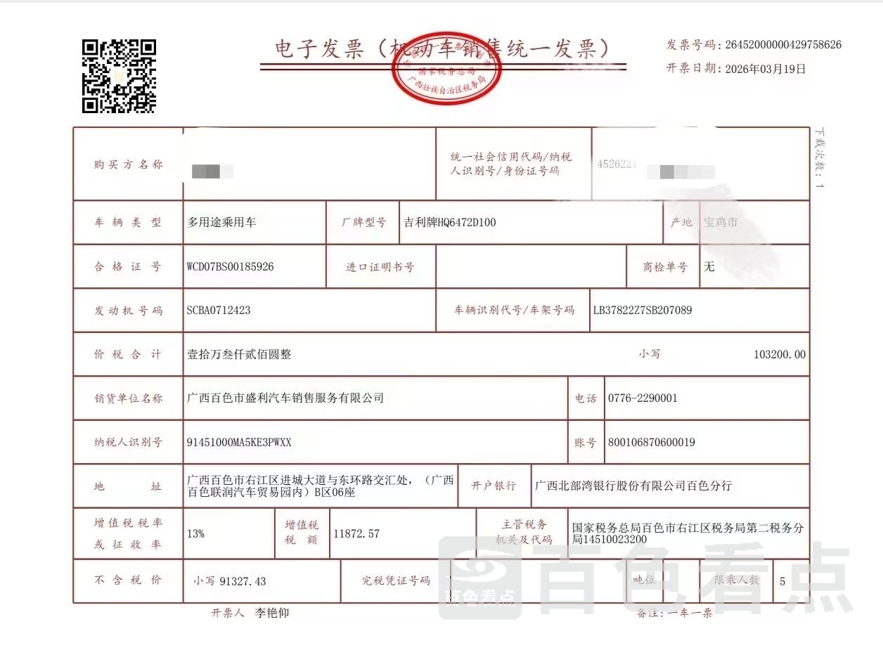 据受害其中一位爆料者称,2026年3月14日,他本人与百色市盛利汽车销售服务有限公司签订购车合同,订购第四代博越L车型。3月16日,该消费者按照约定一次性付清购车全款116888元,双方约定3月26日正式交付车辆。3月19日,4S店为其开具了正规购车发票,自己随即凭票缴纳车辆购置税9132.74元、购买车险1250元,并花费30元办理临时牌照,所有上牌前手续全部办结。可到了约定交车日期,4S店并未按约交车,没过多久更是直接关门闭店,店内空无一人,负责人电话始终无法接通,彻底失联。