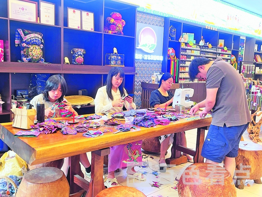“我想做一个迷你款的麽乜钥匙扣!”“我想做几个印有福字的麽乜,送给家人!”馆内的手工制作体验区里,市民与游客参与热情高涨。60多岁的黄阿姨带着孙女认真缝制,她笑着说:“我小时候就跟着外婆做麽乜,现在带孙女来体验,就是想让她记住咱们民族的老手艺。”这一针一线间,传递的不仅是非遗技艺,更是民族文化的传承与亲情的交融。