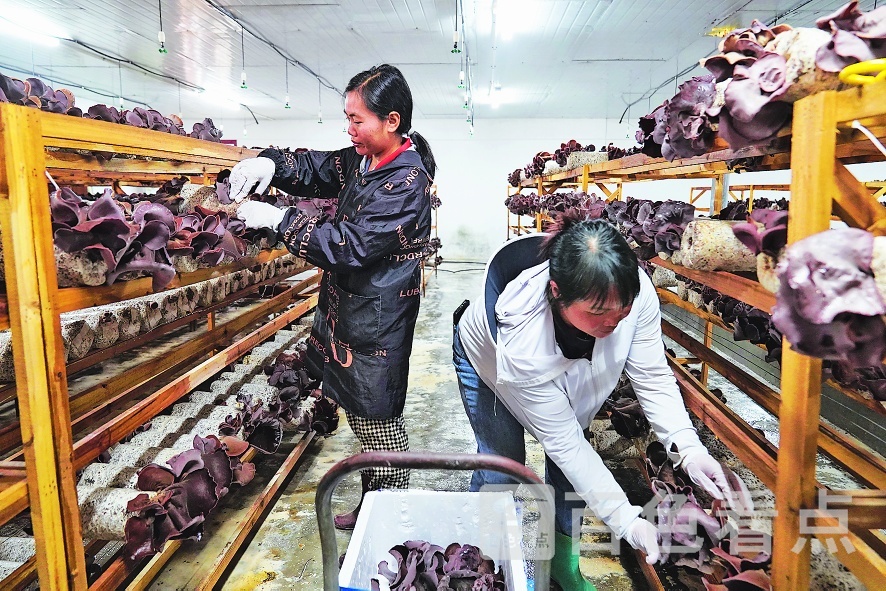 图为工人在采摘毛木耳。 □黄 琪 摄