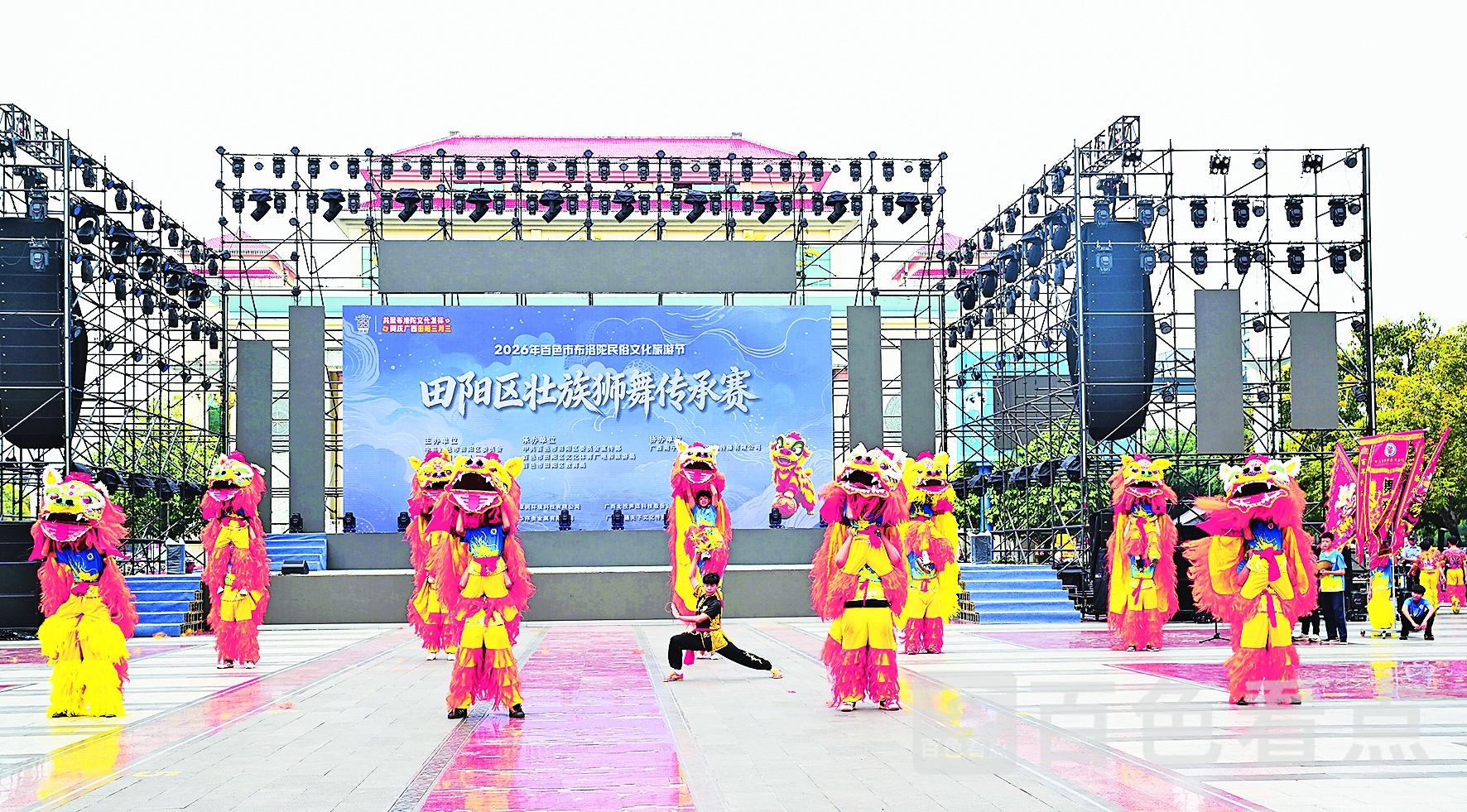 4月22日,百色市布洛陀民俗文化旅游节活动精彩纷呈。在田阳区布洛陀文化中心广场上,壮族狮舞传承赛开赛。此次壮族狮舞传承赛分为中小学生组、成人组,小选手们稚气未脱却动作娴熟,将狮子的灵动可爱演绎得惟妙惟肖;成人选手技艺精湛、配合默契,尽显狮舞文化的深厚功底。
