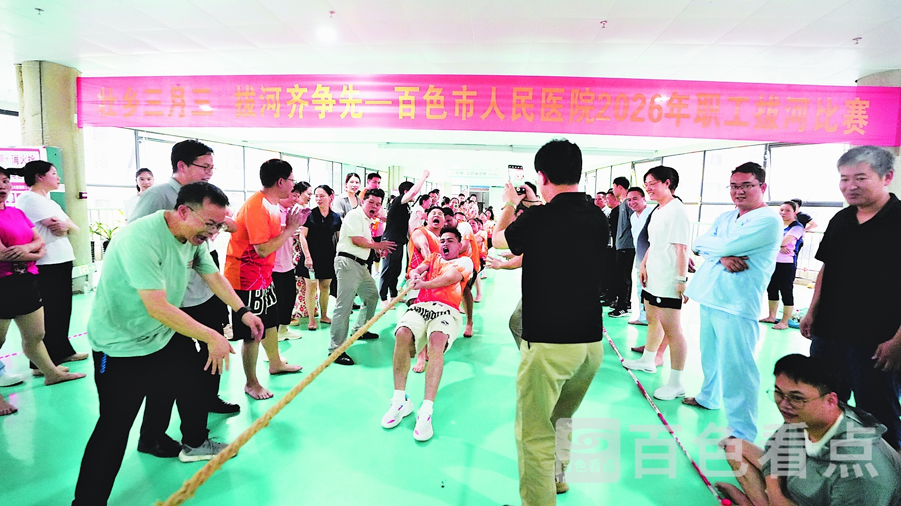 本报百色讯 为欢庆广西三月三传统节日,丰富职工文化生活,增强团队凝聚力,近日,百色市人民医院在该院连廊二楼举办职工拔河比赛。该院50支来自各临床、医技、行政后勤科室的职工代表队同台比赛,在一根长绳间比拼团结力量,展现新时代医务工作者昂扬向上的精神风貌。