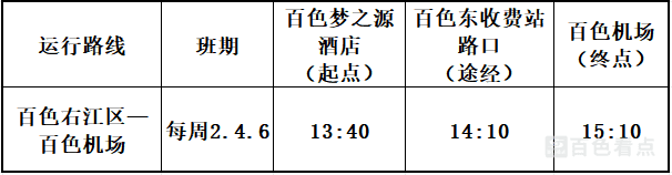 为配合复航航线的旅客出行需求,百色机场同步公布了对应班期的机场巴士发车时刻表。机场巴士运行路线为百色右江区-百色机场,班期与航班保持一致,为每周二、周四、周六。去程发车时刻为13:40从起点百色梦之源酒店发车,14:10途经百色东收费站路口,15:10抵达百色机场;返程从百色机场发往右江区的班次,将根据航班进港时间动态发车,经停百色东收费站路口,终点为百色梦之源酒店。