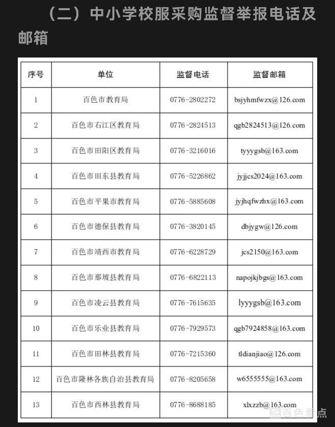 为畅通举报路径,公告按专项领域分类,分别公布了中小学教材教辅管理、中小学校服采购、中小学“校园餐”管理三大类对应的专项监督举报电话及邮箱,覆盖百色市本级及各县(市、区)。公告同时明确,相关举报渠道的受理时间为工作日8:00-12:00、15:00-18:00。